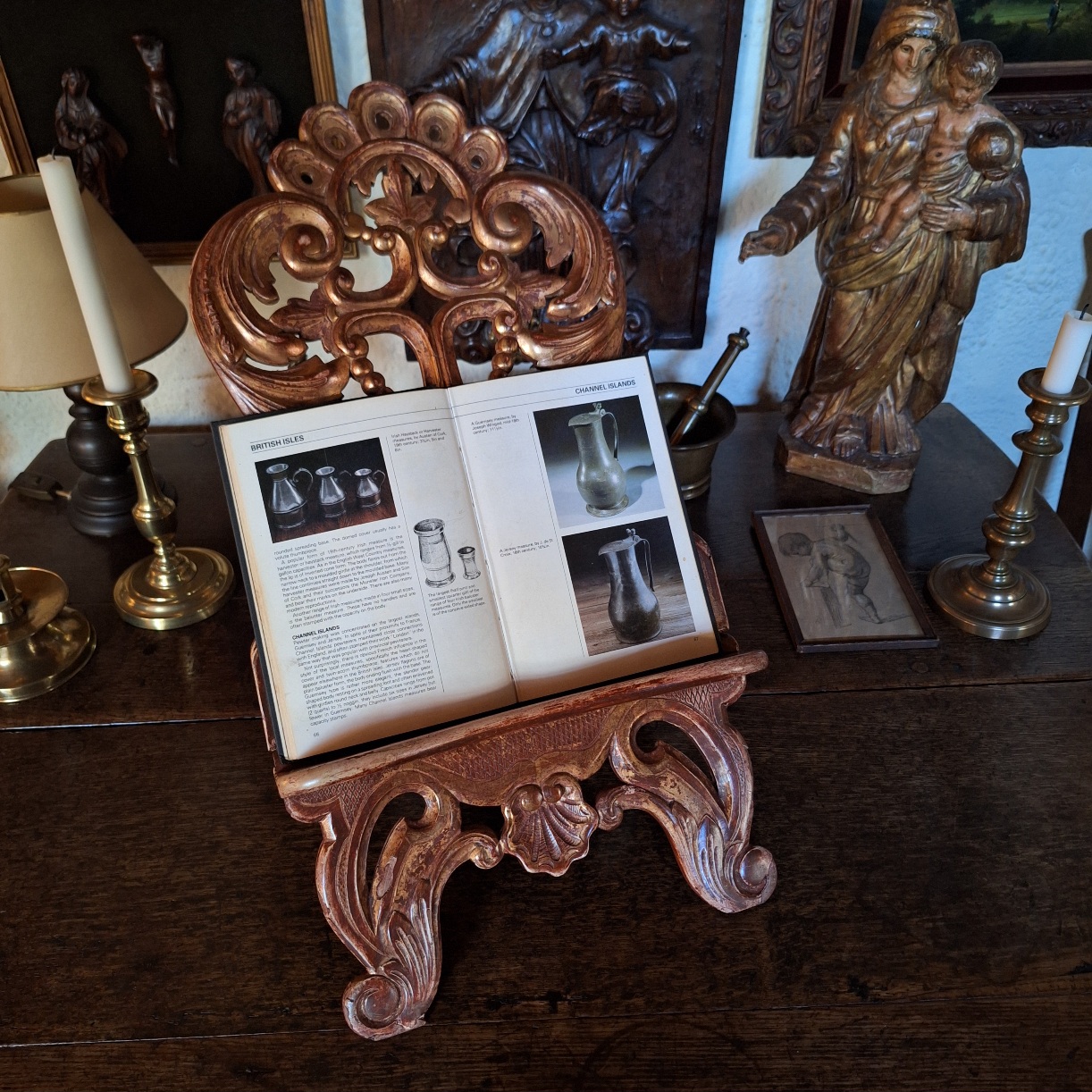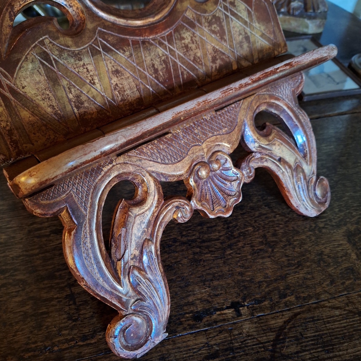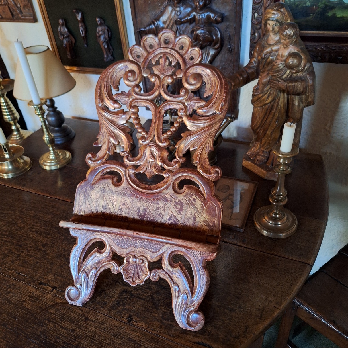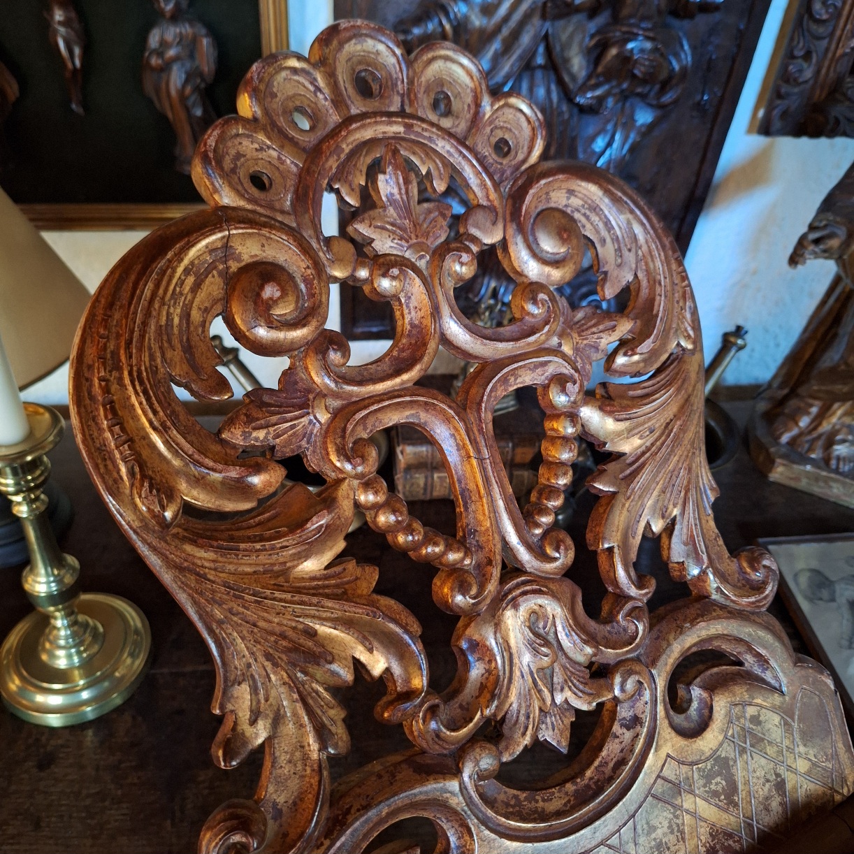 Elegante antieke lezenaar, vervaardigd uit rijk gestoken hout met resten van de oorspronkelijke vergulding. Uitgevoerd met sierlijke rocailles en bladmotieven, met een fraai opengewerkte rug. De mooie patina en lichte slijtage geven het stuk een authentieke en karaktervolle uitstraling.