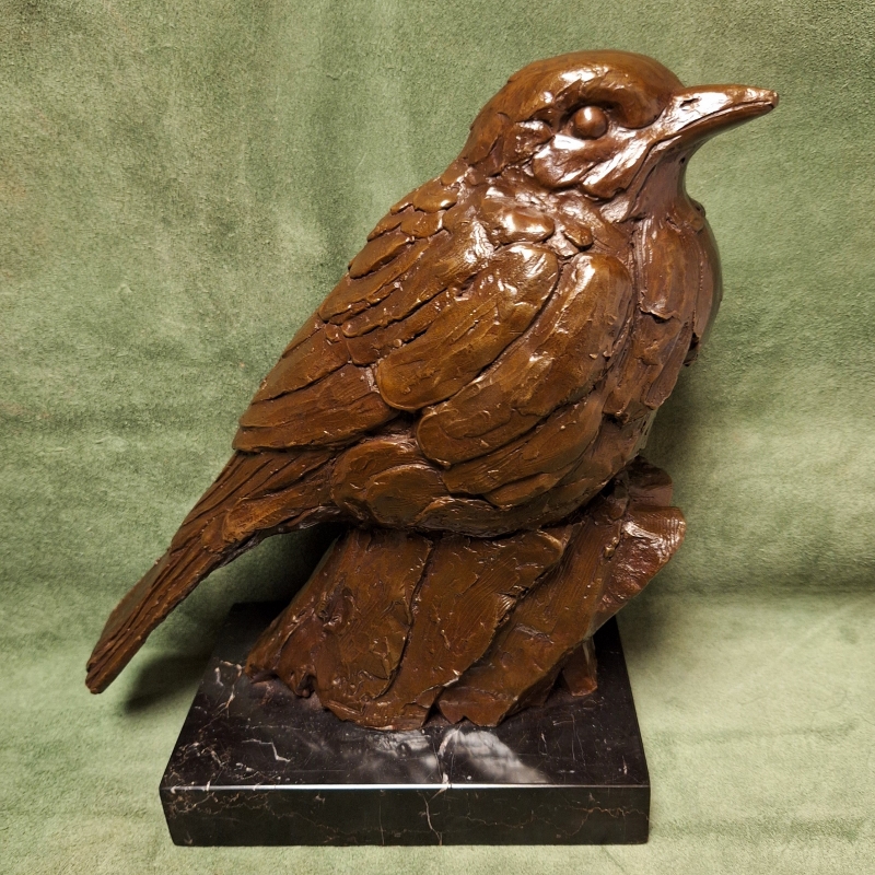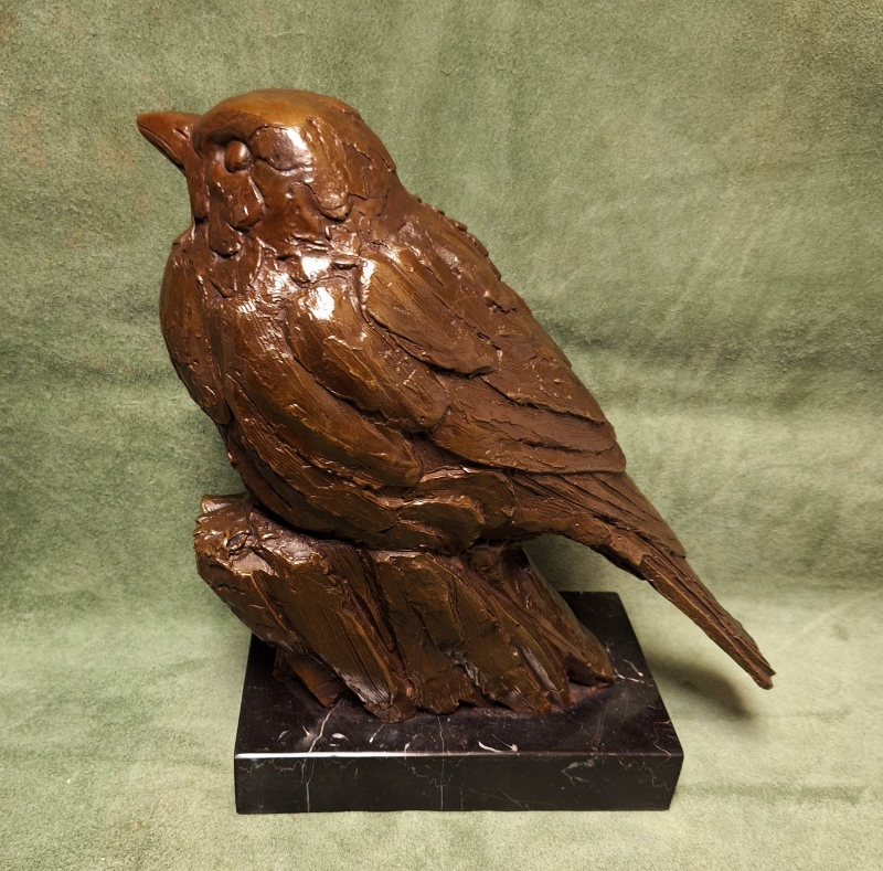 Grote bronzen vogel / Merel. Gesig: Milo Afmetingen: totale hoogte 25cm. Van kop tot staart 31cm. Marmeren voet 16cm x 10cm. Prijs: 300,- euro.