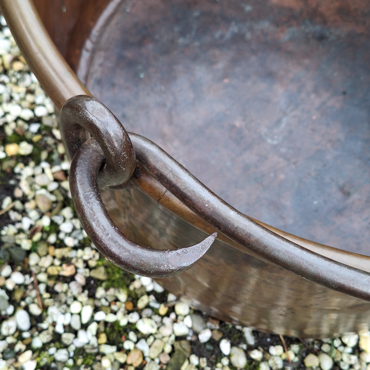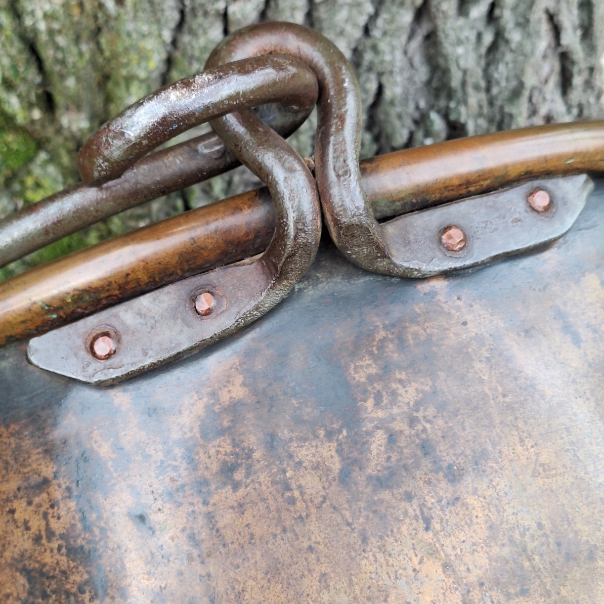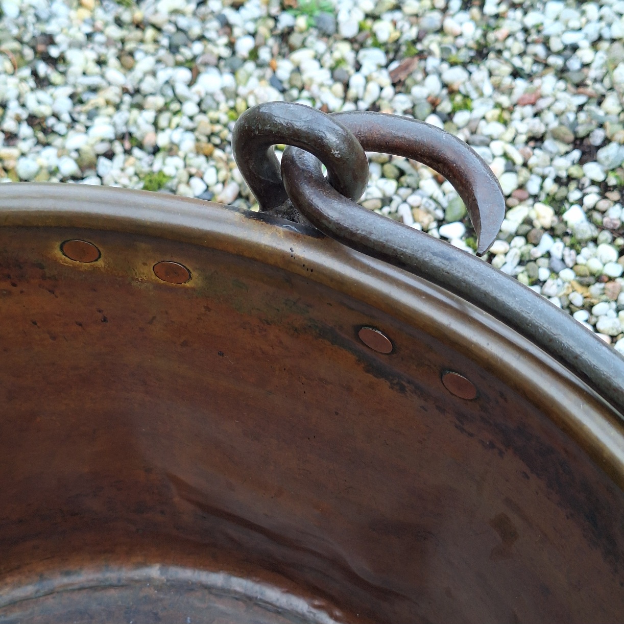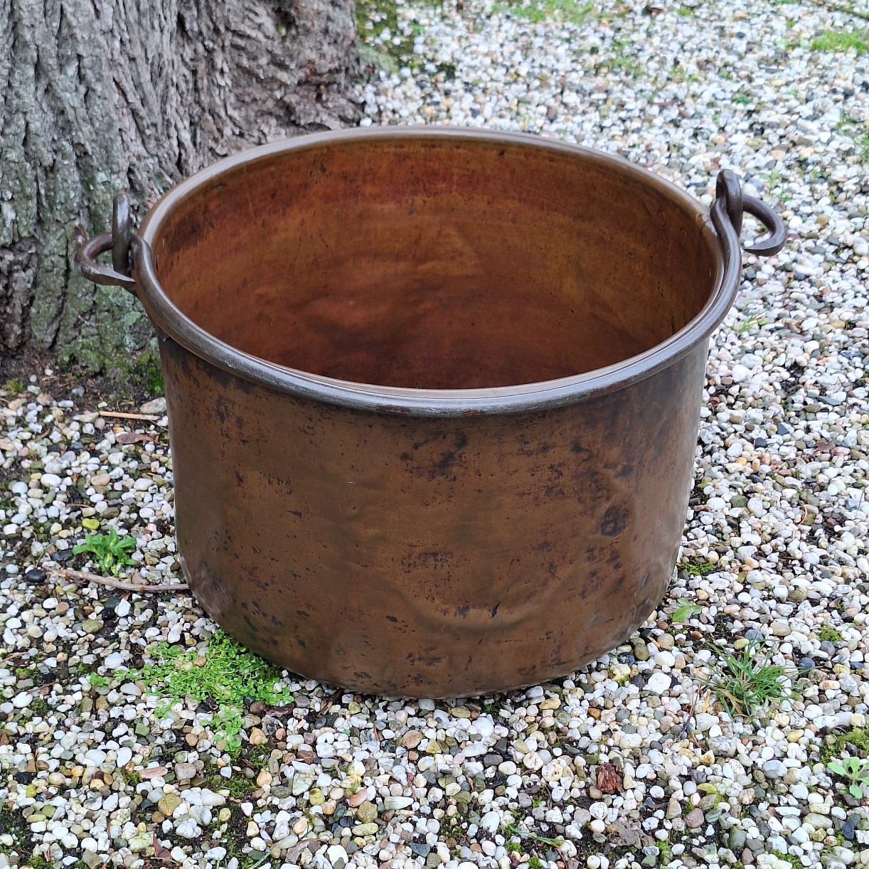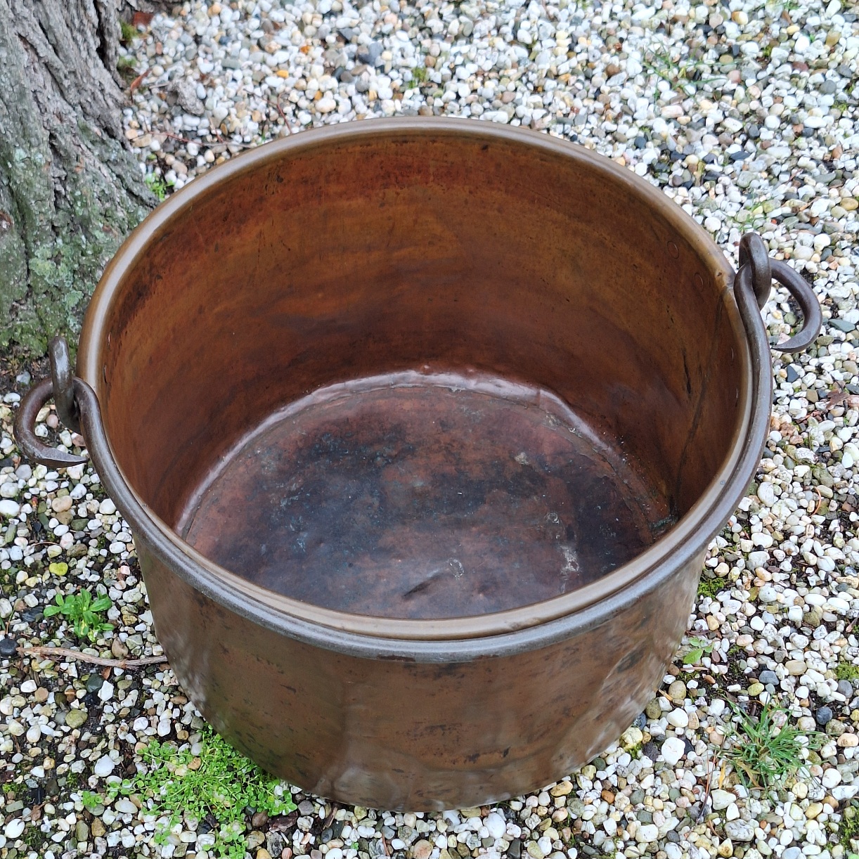 Mooie gave koperen hout bak met ijzeren hengsel. Afmeting: 50cm doorsnee en 32cm hoog. Prijs 200,- euro.