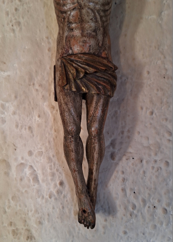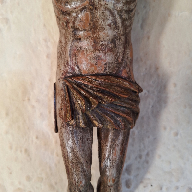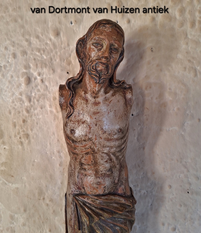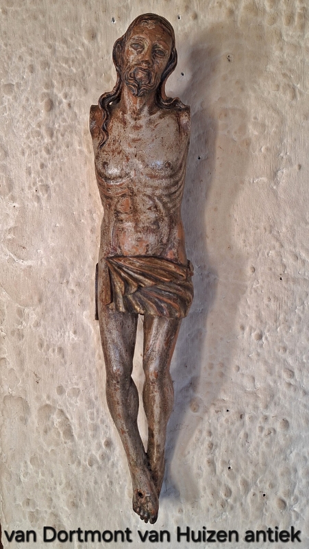 Corpus, Notenhout met originele polychroom. Herkomst: Zuidelijk Europa. Datering: 2e helft 17e eeuw. Afmeting: 44cm. Prijs: 875,- euro.