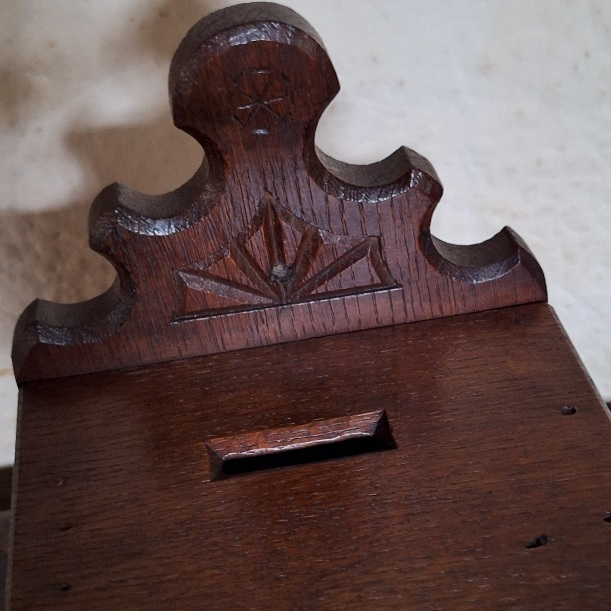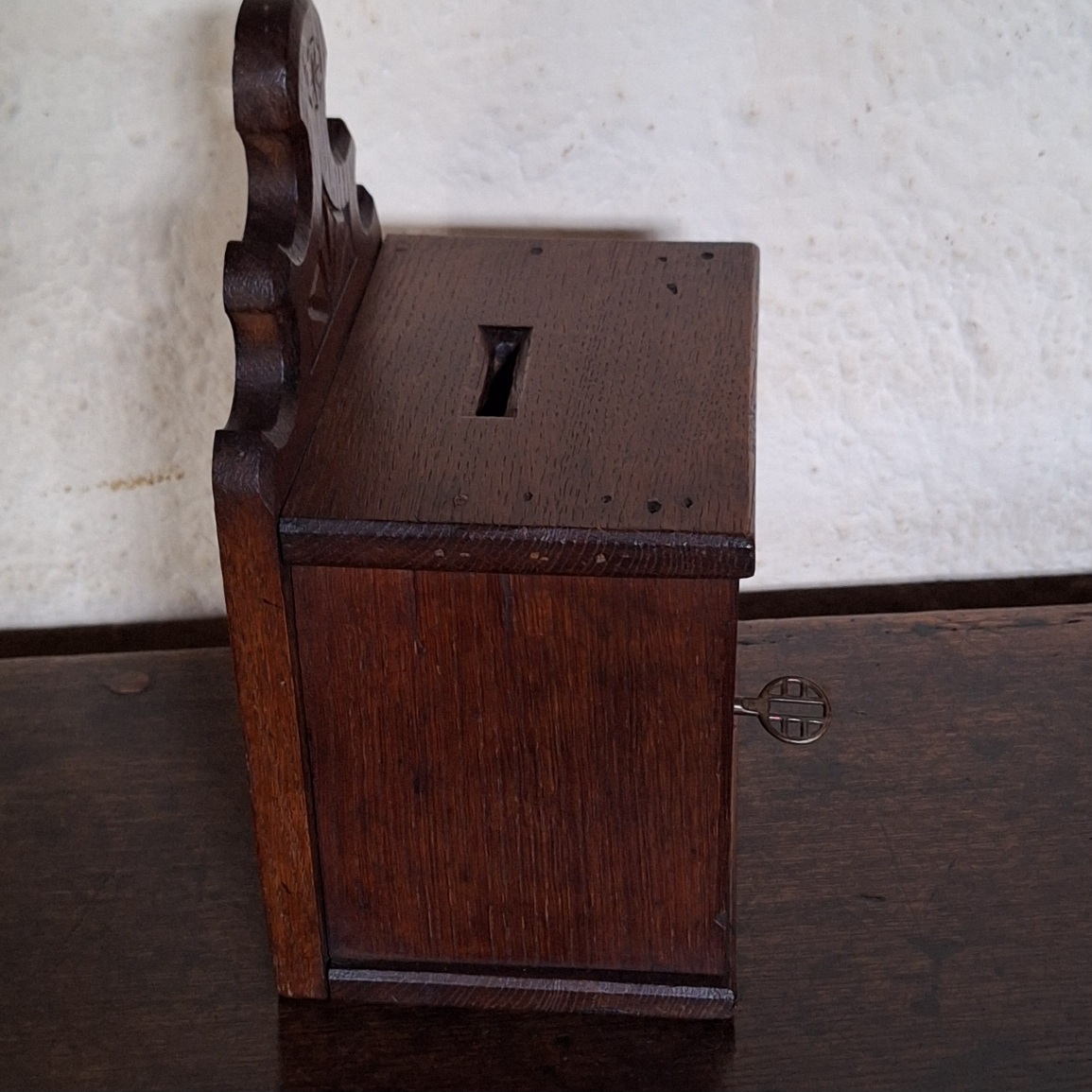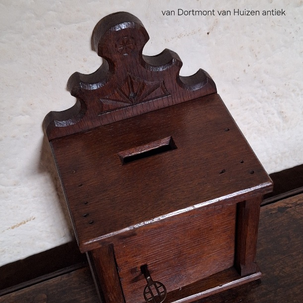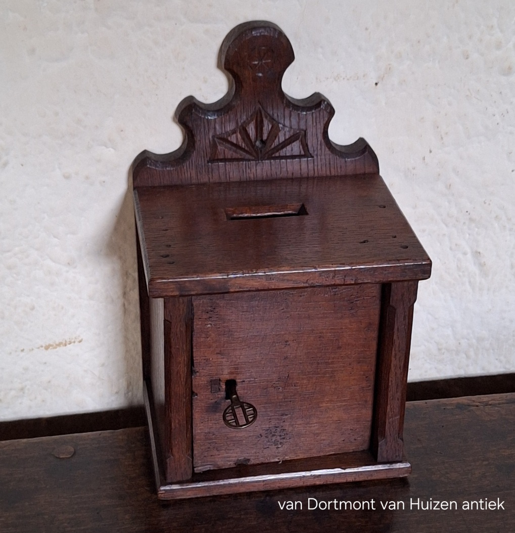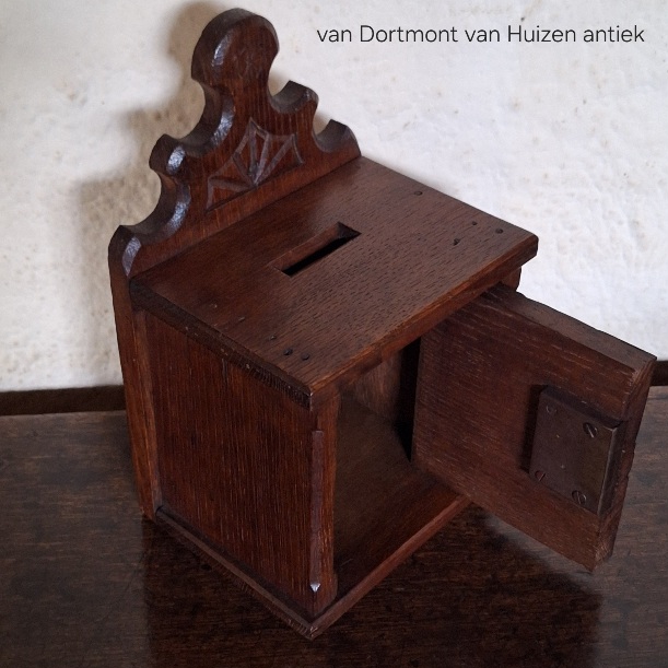 Vlaams eiken offerblok met werkend slot. Datering: 19e eeuw. Afmeting: 19cm breed, 15cm diep en 30cm hoog. Prijs: 135,- euro.